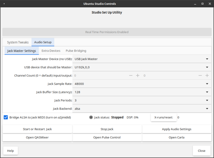 Jack is a low latency capable audio and midi server, designed for pro audio use. It enables all Jack capable applications to connect to each other. The preferred method of controlling Jack with Ubuntu Studio is Studio Controls (pictured):