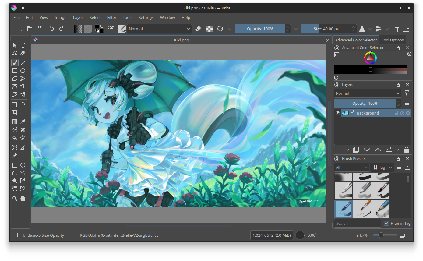 Krita is a creative application for raster images. Whether you want to create from scratch or work with existing images, Krita is for you. You can work with photos or scanned images, or start with a blank slate. Krita supports most